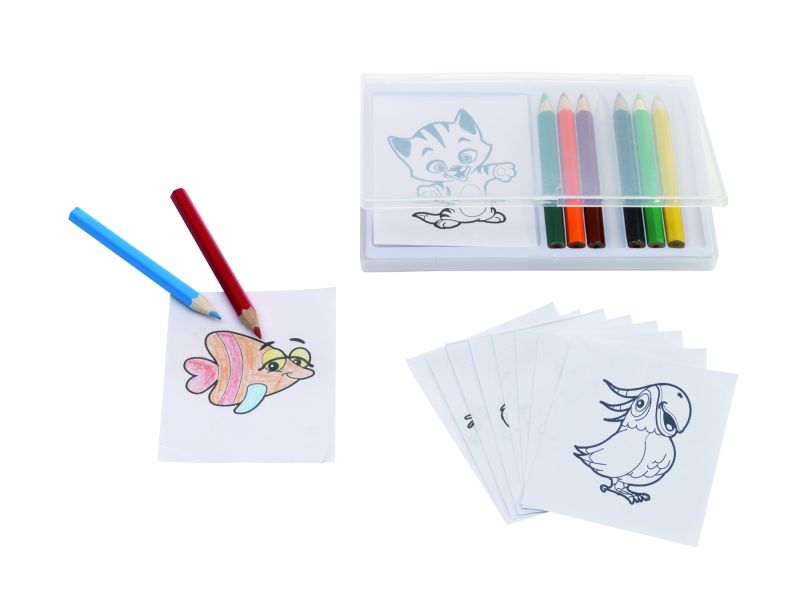 Werbeartikel Beschreibung: Malset CRAZY ANIMALS : inkl. 12 Malblätter mit verschiedenen Tiermotiven zum Ausmalen, 8 lackierte Buntstifte, angespitzt, in transparenter Box
