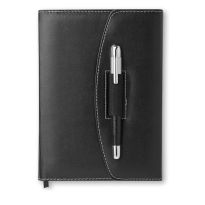 DIN A5 Portfolio aus PU. Block mit 120 Blatt (240 Seiten) liniertem Papier und farblich passendem Metallkugelschreiber. Schwarze Tinte.