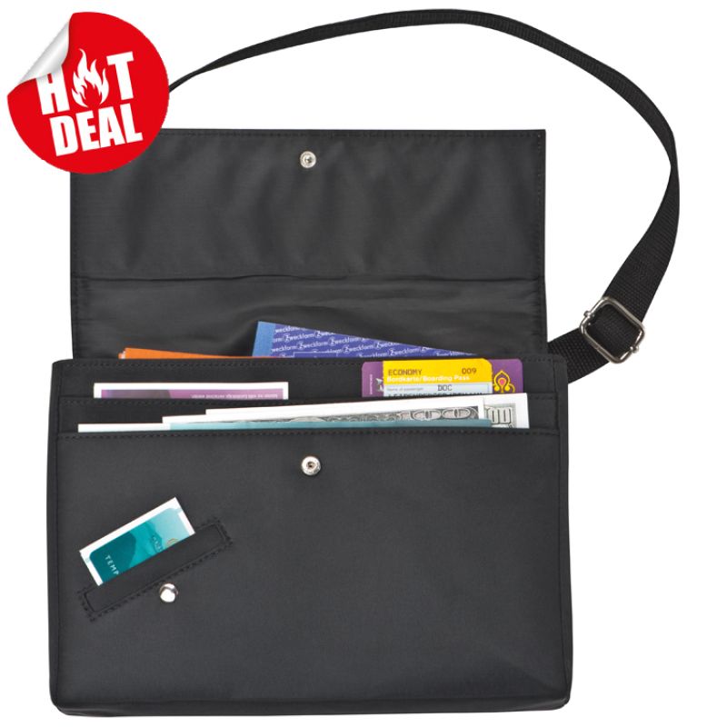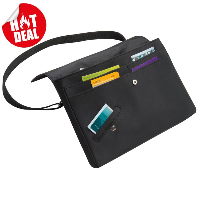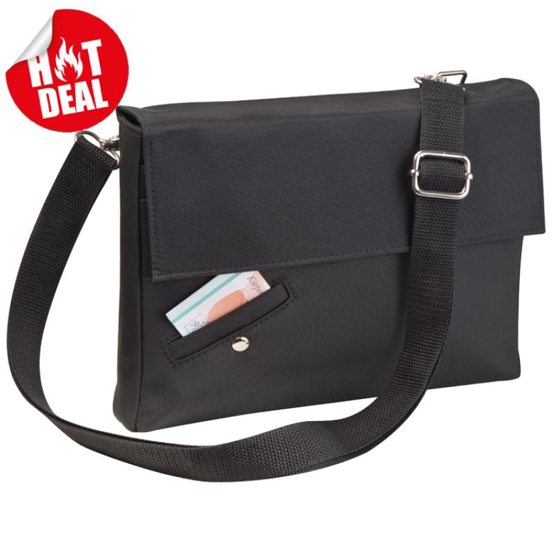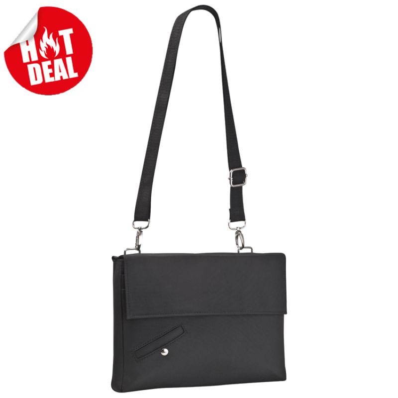 Werbeartikel Beschreibung: Umhängetasche aus Microfaser mit verschließbarem Druckknopf, vielen Einsteck- und einem großen Hauptfach. Ihre Werbung wird vorne auf die Tasche gedruckt.