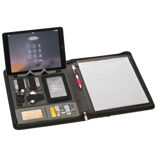 Werbeartikel Beschreibung: Schreibmappe aus Kunstleder A4 mit integrierter Powerbank (Kapazität 5.000 mAh), USB-Ladekabel, 8 Einsteckfächern, Handyfach, Kugelschreiberschlaufe, Tablethalterung und Schreibblock. Ihre Werbung drucken wir außen auf die Schreibmappe.