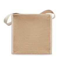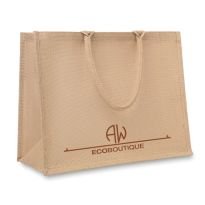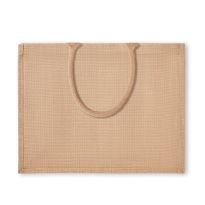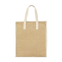 Shopper aus Jute mit kurzen Henkeln, Boden- und Seitenfalte sowie laminierter Innenseite.