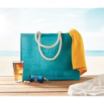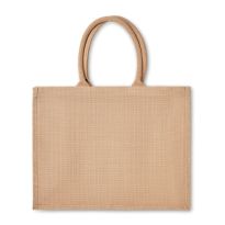 Einkaufs- oder Strandtasche aus laminierter Jute. Kurze Tragegriffe aus Baumwolle.