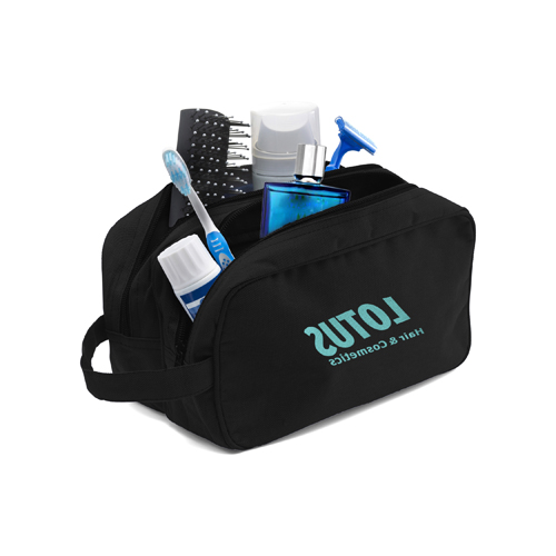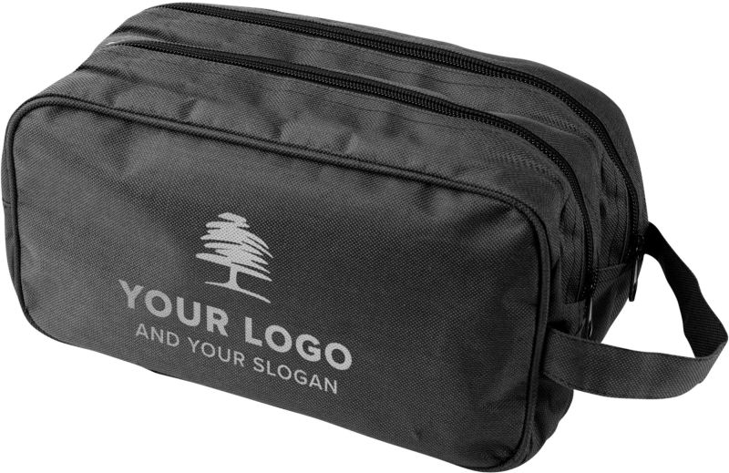 Werbeartikel Beschreibung: Kulturtasche aus Polyester (600D), mit 2 RV-Hauptfächern, Handschlaufe und Metall-Zipper.