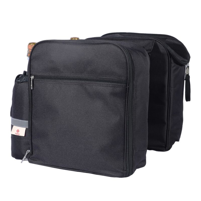 Geräumige Doppel-Picknick-Fahrradtasche mit umfangreichem Essgeschirr auf der einen Seite. Das Fach auf der anderen Seite ist mit Isoliermaterial gepolstert. Die isolierten Flaschenhalter haben reflektierende Streifen für zusätzliche Sicherheit. Dank der Universalhaken kann diese Tasche an vielen Arten von Gepäckträgern, einschließlich E-Bikes, befestigt werden.