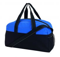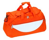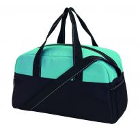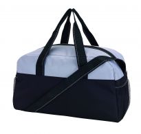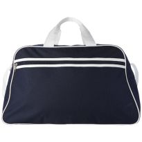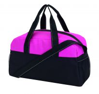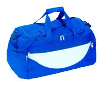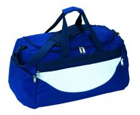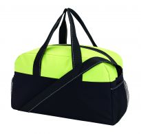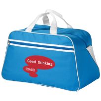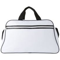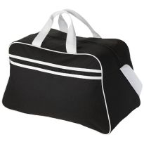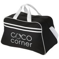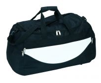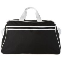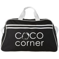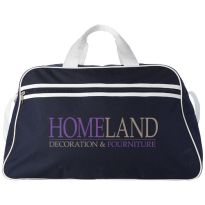 Geräumige Sport- oder Reisetasche aus 600D Polyester mit weich gepolstertem Schultergurt und Vorfach mit Reißverschluss. Ihre Werbung drucken wir zentriert auf die Vortasche zwischen den schwarzen Streifen.