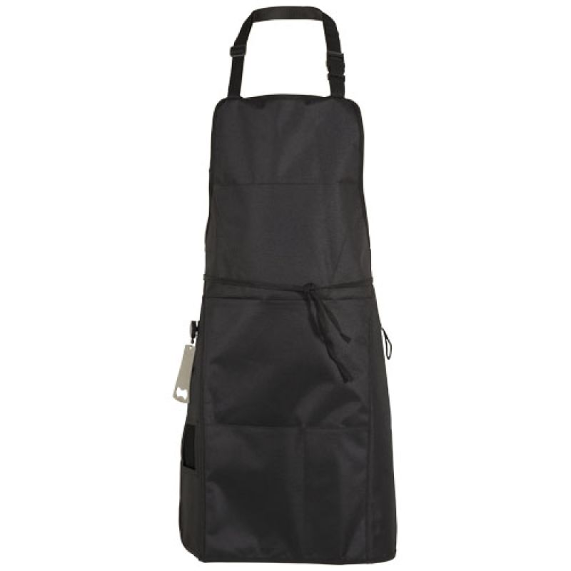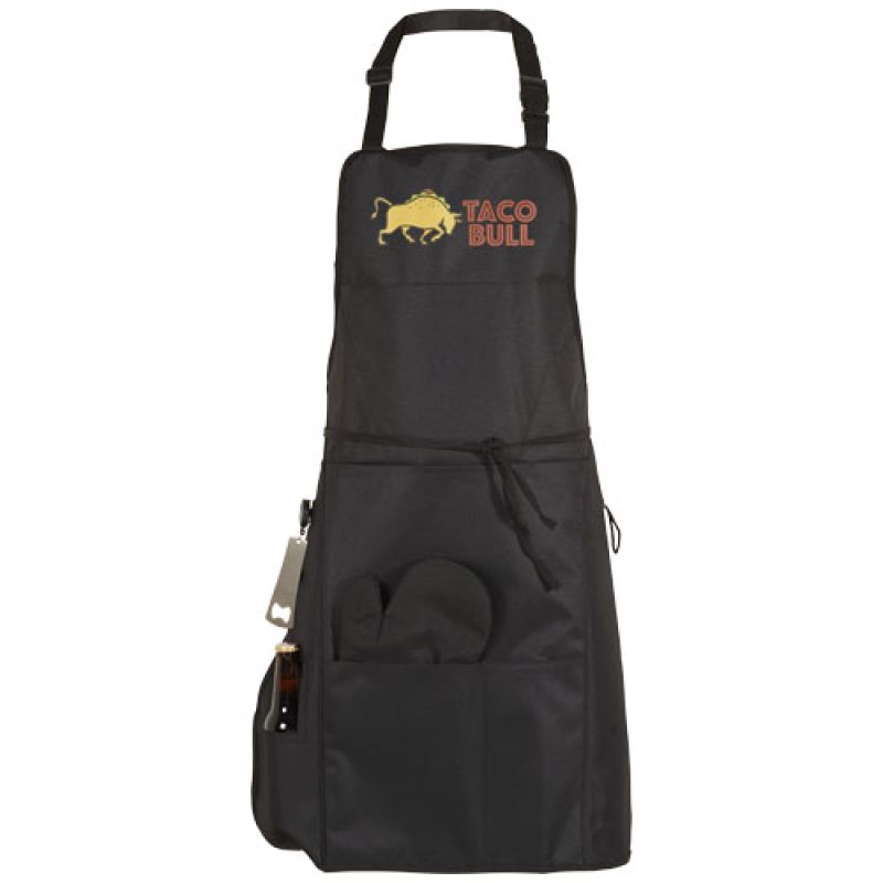 Werbeartikel Beschreibung: Grill BBQ Schürze. Diese Schürze hält Ihre Grill-Werkzeuge in Reichweite. Verfügt über eine isolierte Tasche für die Aufbewahrung von Getränkeflaschen, einen abnehmbaren Flaschenöffner, gepolsterten Ofenhandschuh und Handtuchschlaufe sowie zwei Fronttaschen, um andere Grillutensilien zu verstauen. 600D Polyester, Edelstahl und Baumwolle.