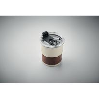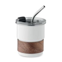 Einwandiger Becher aus recyceltem Edelstahl (90% recycelter Edelstahl, 10% Edelstahl) mit abnehmbarem Griffteil aus Akazienholz. Trinkhalm aus Edelstahl mit Halterung. Auslaufsicherer Deckel mit Trinköffnung. Füllmenge: 260 ml.