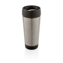 Isolierbecher EXCLUSIVE LIQUID , doppelwandig: außen aus Edelstahl in futuristischem Design und mit dekorativem Silikonring, innen aus Kunststoff, Deckel mit sicherem Schraubverschluss und integrierter Trinköffnung zum Aufklappen, gummierter Standfuß für gute Bodenhaftung, Füllmenge ca. 400 ml