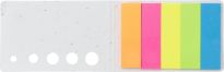 Lesezeichen versehen mit 15 selbstklebenden Memoblättern (pro Farbe/Format): 1 Block (44x40mm) und 5 selbstklebende Streifen (44x12mm) in verschiedenen Farben.Qualität: 70g/m2Blatt: 15 pro FarbeSeitenmarkierungen: blancoPapierfarbe: orange, pink, gelb, grün, blau, hellgelb