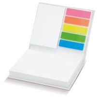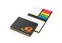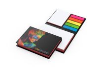 Kleiner Notizblock mit Memo- und Haftnotizen. Große Druckfläche auf der Vorderseite und Hinterseite des Covers.Qualität: 80g/m2Blatt: Groß: 100; Medium: 25; Strips: 5 x 25Seitenmarkierungen: blancoPapierfarbe: orange, pink, hellpink, gelb, grün, weiß