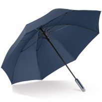 Regenschirm mit 190T Pongeebespannung, Sturmfunktion, automatischer Teleskopfederung, Glasfaserrahmen und -schaft, Soft-Handgriff und Klettverschluss.